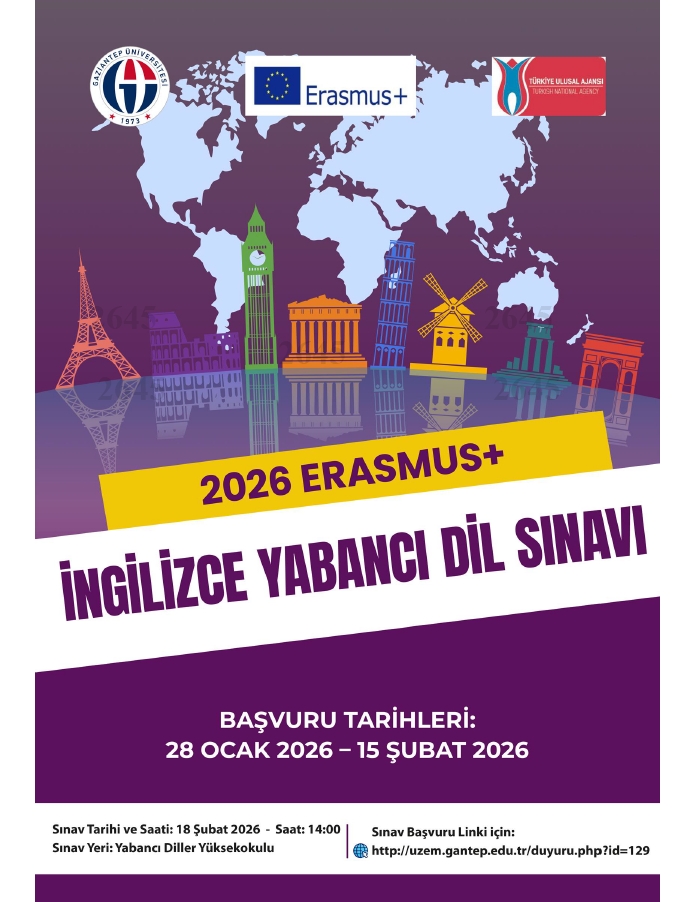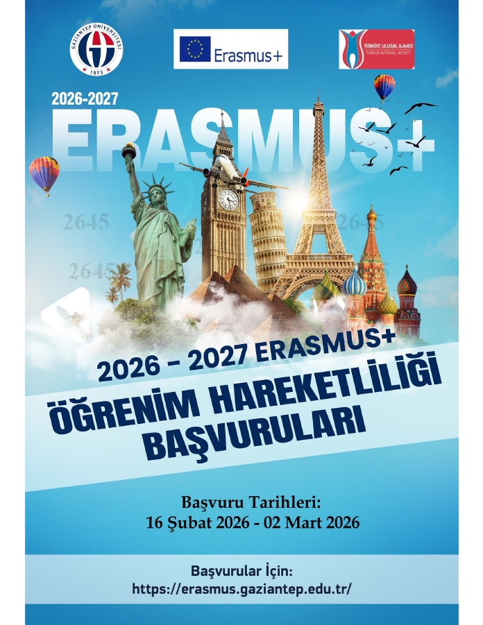 2026 - 2027 Erasmus+ Öğrenim Hareketliliği başvuruları 16 Şubat - 02 Mart 2026 tarihleri arasında Türkiye Ulusal Ajansı Erasmus+ Başvuru Portalı üzerinden (http://erasmusbasvuru.ua.gov.tr) e-devlet kullanıcı adı ve şifresi girilerek yapılacaktır. Erasmus+ İngilizce Yabancı Dil Sınavı ve Erasmus+ Öğrenci Öğrenim Hareketliliği Başvuruları için ekte duyuru afişleri paylaşılmıştır.